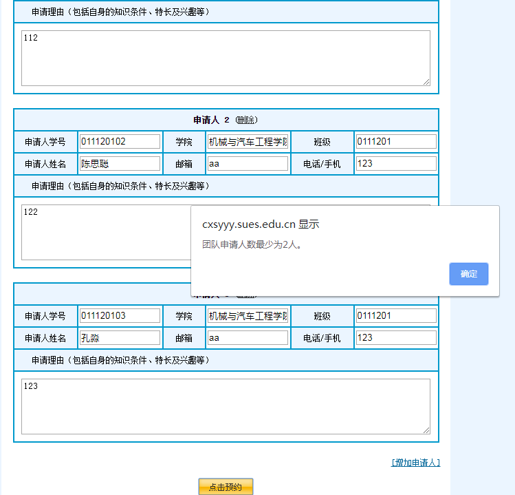 网站地址:http://cxsyyy.sues.edu.cn,也可从集团首页下方的“教学资源服务站点”中快速链接,初始密码为6个“1”。先查看预约申请流程,再选择实验项目,以团队为单位进行申请预约,具体操作由队长一人完成。