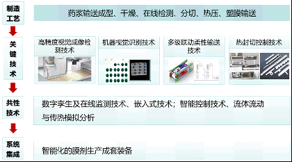 该技术主要包括药浆输送成型、干燥、在线监测、热压、分切、塑膜输送等工艺,同时通过识别系统完成次品剔除和正品的包装,是集传输、识别、控制和材料物性于一体的多功能集成(技术路线见图7)。该方向拟通过高精度视觉成像检测技术、及其视觉识别技术、多级联动柔性输送技术、热封切控制技术的系统集成,结合智能控制系统开发,推动膜剂成套装备迭代升级,实现高水平智能装备,替代国外进口装备。