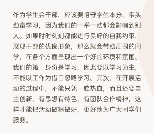 即便在员工会工作,我们依然还是员工,学习依旧是我们的本职工作,不能以员工会的工作为理由而耽误自己的学习。其次,员工工作以为员工服务为宗旨,全心全意为公司或公司的员工服务。不能只做表面功夫,要脚踏实地,求真务实地完成员工工作。