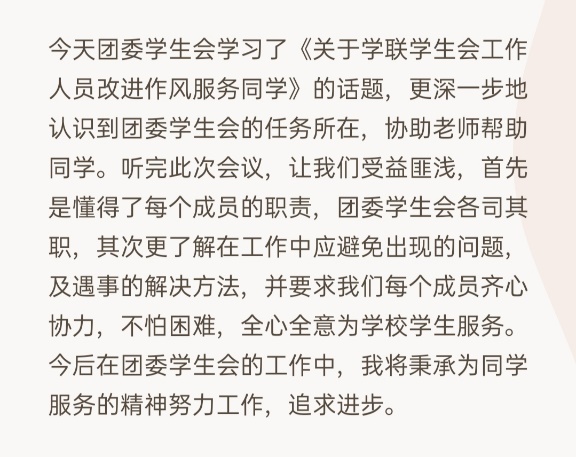 此次会议通过对《关于学联员工会工作人员改进作风服务同学的若干规定》六条的学习,指出各部门要勤于反省和自我批评,把努力为同学服务放在员工工作的首要地位,扎根同学、求真务实,坚决抵制社会不良风气的侵蚀。