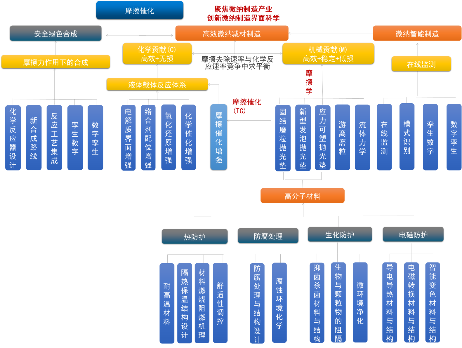 团队以摩擦催化为核心技术与创新基础,聚焦微纳制造产业,尤其是第三代半导体材料的超精密加工,围绕微纳制造CMP抛光材料、材料表面微纳结构处理、微纳智能制造研究方向创建微纳制造新材料交叉学科。通过超精密加工特性,引入原位功能场,引领创新超精密制造用材料的多功能化。团队主要致力于: