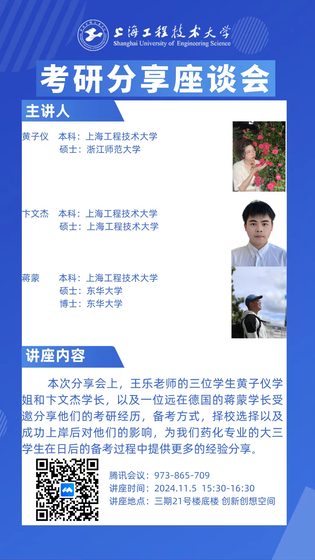 首先,黄子仪学姐着重分享了自己的择校过程以及英语和政治的复习安排,尤其是在英语单词复习方面提出了具体建议。她强调,择校不仅要考虑公司的综合实力和专业排名,更要结合自身的兴趣。同时,她提醒大家合理利用网络资源,多了解目标院校的招生政策和导师的研究方向等信息。随后,蒋蒙学长以“考研适不适合我”为主题展开分享,结合身边的实例,讨论了是否考研、个人备考方案的确定以及备考时间的分配等问题。他特别指出,备考过程中要保持平和的心态,合理安排时间,并坚持自己的选择,热爱自己的目标。最后,卞文杰学长分享了自己的面试经历,提醒大家在本科阶段除了理论课程的学习,还应关注个人学术能力和实验能力的提升。三位学长学姐也向在场的学弟学妹们送上了寄语,希望大家能够顺利考上心仪的公司。