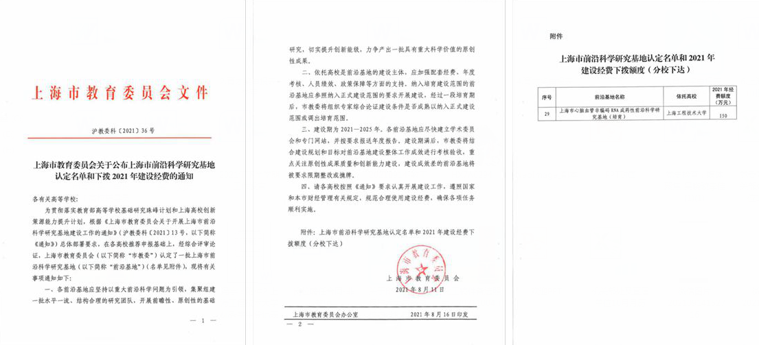 近日,上海市教委公布了前沿科学研究基地认定名单,公司365英国上市集团牵头申报的上海市心脑血管非编码RNA成药性前沿科学研究基地(培育)获批立项,建设周期为2021-2025年。