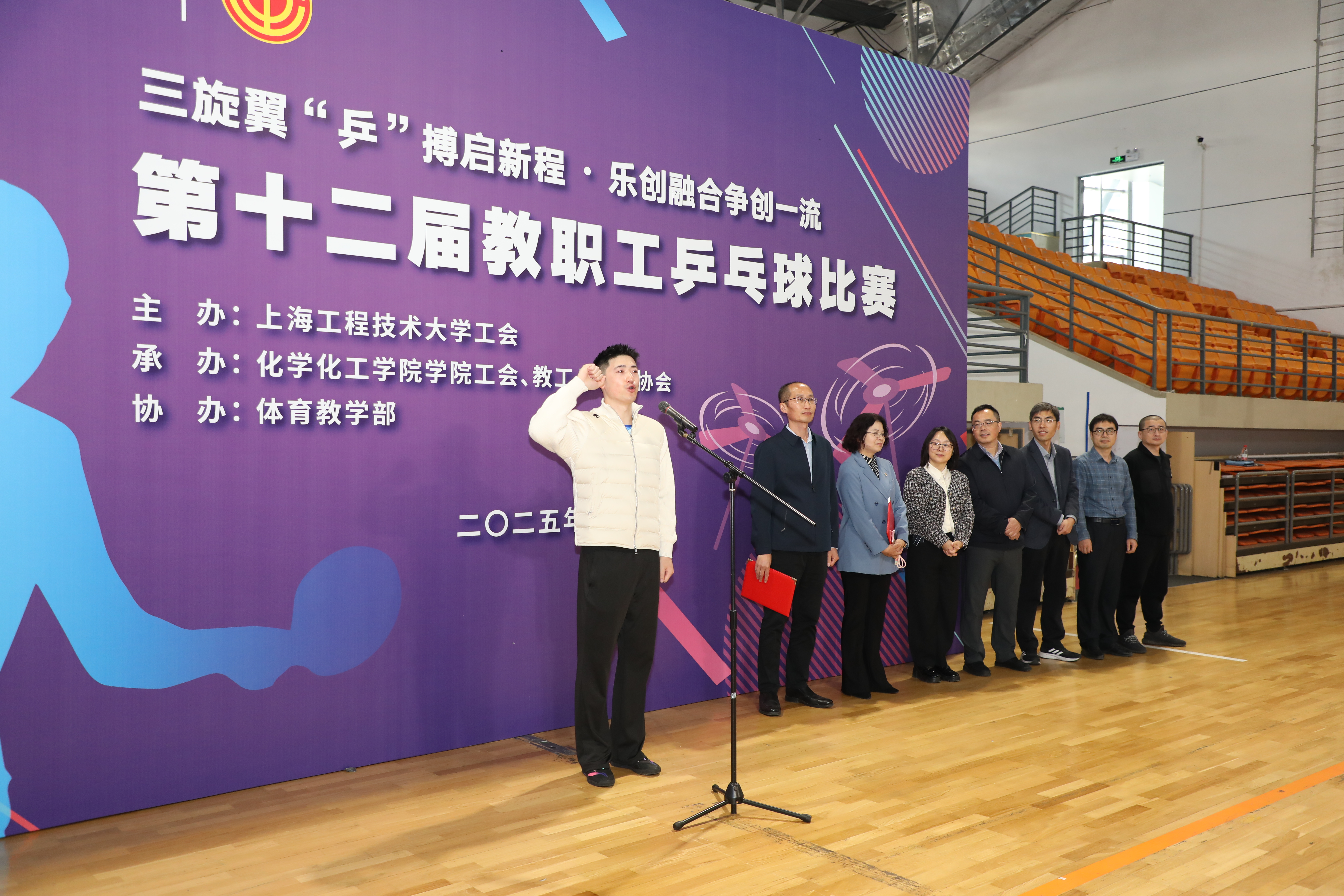 开幕式上,朱书记指出本次赛事不仅是竞技的舞台,更是‘三旋翼’战略落地的实践场。我们要以奥林匹克精神中的‘更快、更高、更强、更团结’为引领,让每一场对决都成为跨学科交流的契机。朱书记讲到,今天的赛场,既是展现个人风采的舞台,更是凝聚集体智慧的熔炉。希望大家通过这场赛事,不仅收获健康的体魄,更能激发出跨学科创新的灵感——让工程技术的严谨、管理协同的智慧、设计美学的创意在球桌两端交融共生,为建设具有鲜明产业特色的世界一流应用创新型大学注入磅礴动能。运动员代表陈佳栋与裁判员樊骁分别宣誓,承诺恪守体育精神与赛场规则。