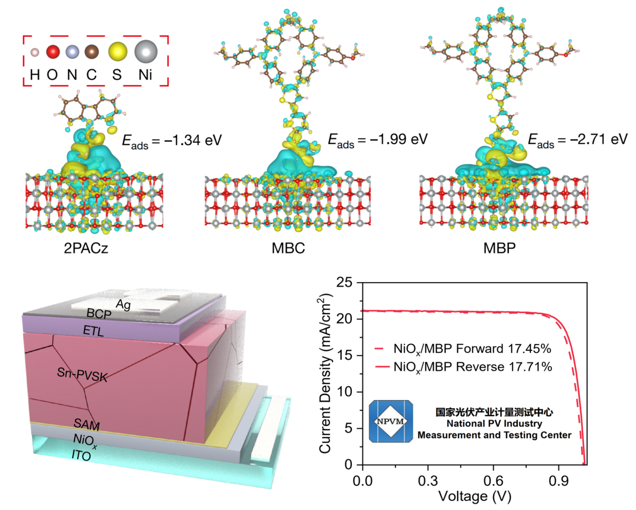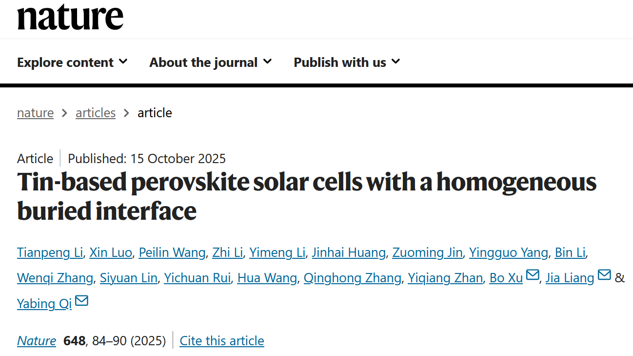 近日,国际顶级期刊《Nature》上刊登了题为“Tin-based perovskite solar cells with a homogeneous buried interface”的研究论文。该论文第一作者为365英国上市集团21届硕士毕业生李天朋,公司芮一川老师等为共同作者。该成果将新型自组装单分子材料引入锡钙钛矿薄膜埋底界面,构建了能级匹配的均匀界面层,实现了空穴提取效率的显著提升;同时该分子薄膜形成的超润湿下层可诱导钙钛矿晶粒定向生长,使薄膜缺陷密度降低40%以上,最终制备的锡钙钛矿太阳能电池认证效率到达17.71%,刷新了世界纪录。