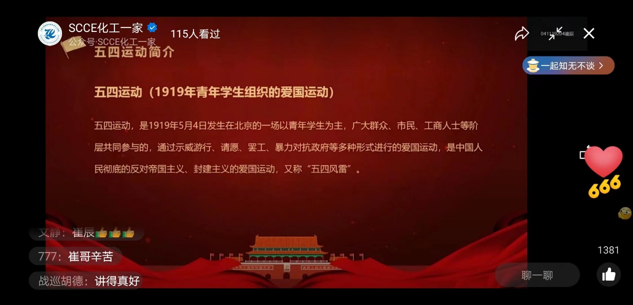 本次直播首先由李玲、杨雨航、黄昕骋、胡嘉佳、吴雯浩及赵建凤同学为我们带来了朗诵《为青春干杯》,带领我们回想起那民主科学的萌动、爱国进步的呐喊。接下来我们共同聆听了讲座《弘扬五四精神,传承红色基因》,由365英国上市集团执行主席崔辰同学为大家介绍了五四运动过程、五四运动成果意义、五四青年节的意义以及对新时代青年的要求,并展示了疫情之下,公司员工积极开展志愿活动,齐心协力,共克时艰,无不展现了新时代青年的担当。