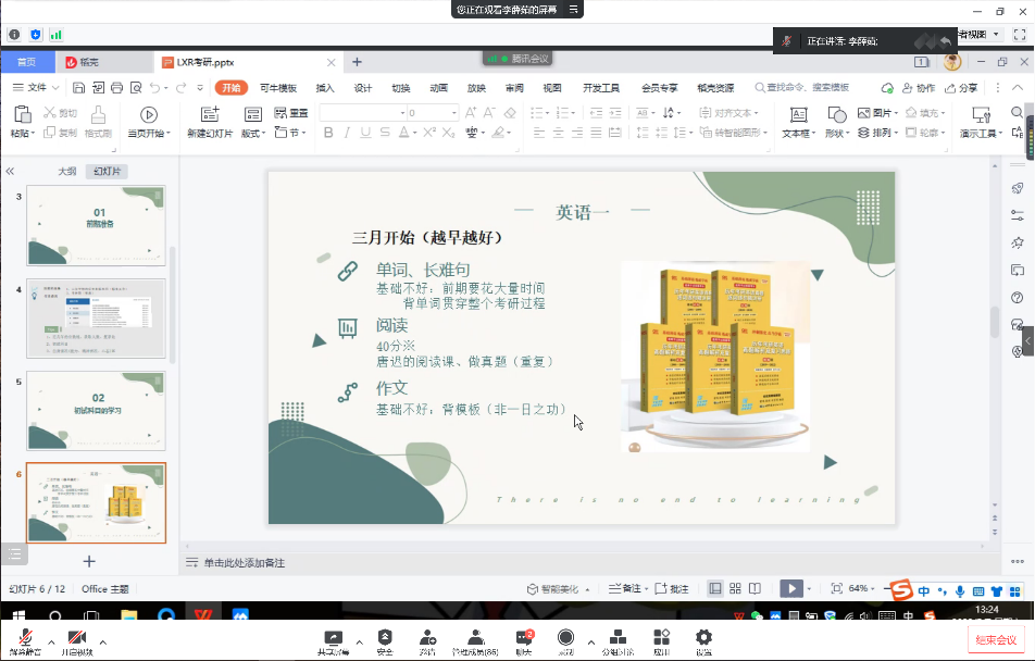 主持人曹鸣同学听完四位学长学姐的讲述后也分享了自己的心得体会,他认为准备考研的每一位同学都是可敬的战士,这是一场攻坚持久战。我们应该做到的,是认清自己的定位,选择好适合自己的学习方法,最终我们一定能成功上岸。