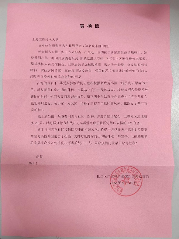 截止到返校工作前,张晓普老师已在社区坚持志愿服务23天,他用超强的执行力和战斗力为社区抗疫工作递交了一份优秀的答卷,其突出表现也得到了社区党组织的认可和肯定。