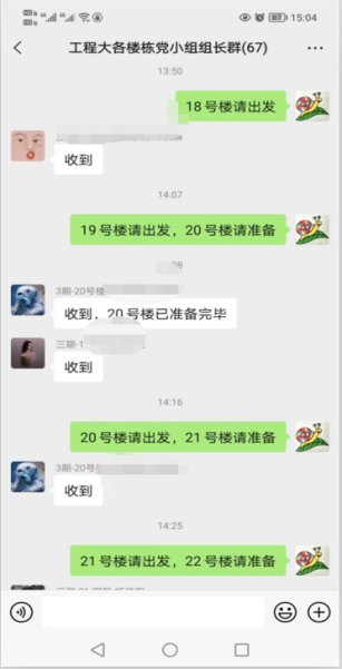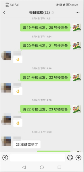 (1)核酸检测楼层长协调员。进校后还在隔离健康观察期间,张晓普老师就参与到了公司日常核酸检测的工作中去,不能到现场工作,他就主动做了员工核酸检测工作楼层长的协调员,负责把采样检测现场的相关信息在第一时间传达给待出发楼栋的组织老师,确保员工检测队伍前后有序衔接。