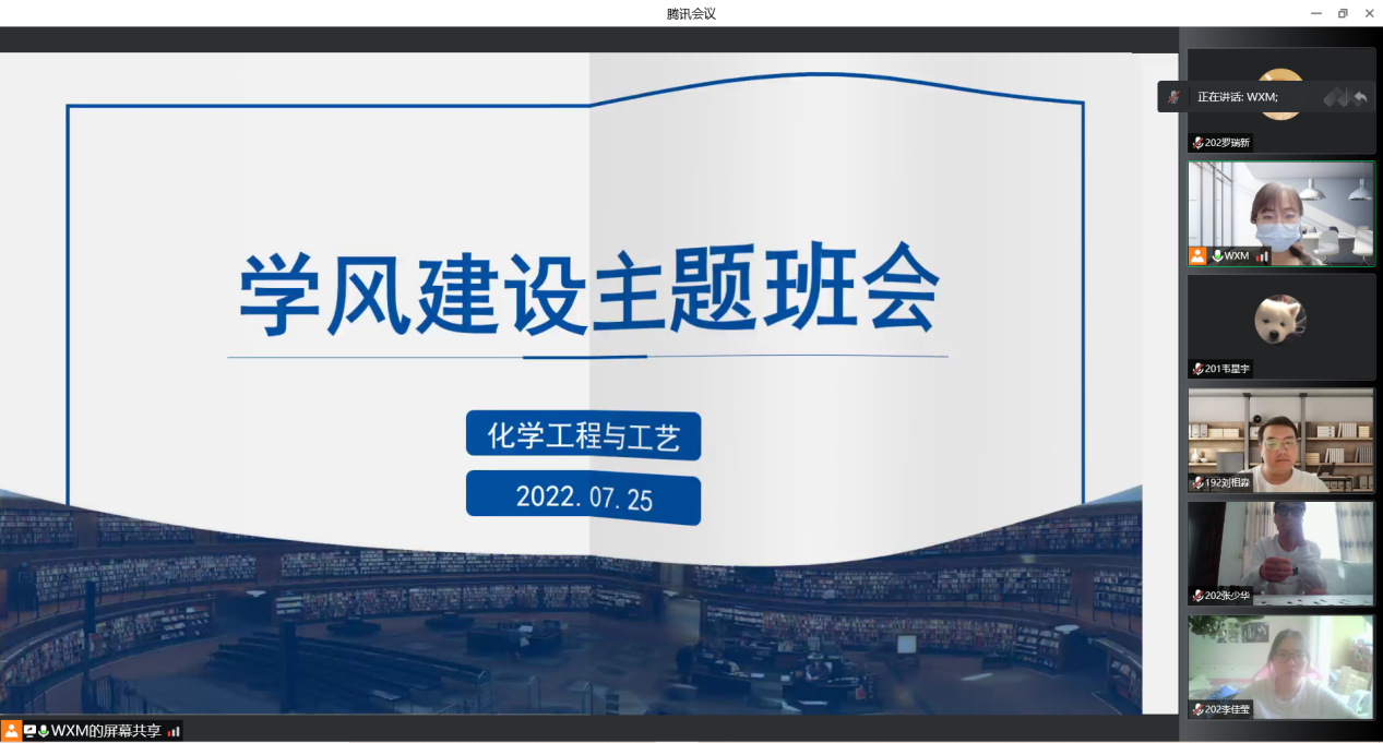 2022年7月25日下午,化学工程与工艺专业通过腾讯会议开展了“学风建设”主题班会活动。本次会议由辅导员王小萌主持,参会人员有班主任芮一川、刘锡建、赵家昌、万文亚及化工专业全体员工。