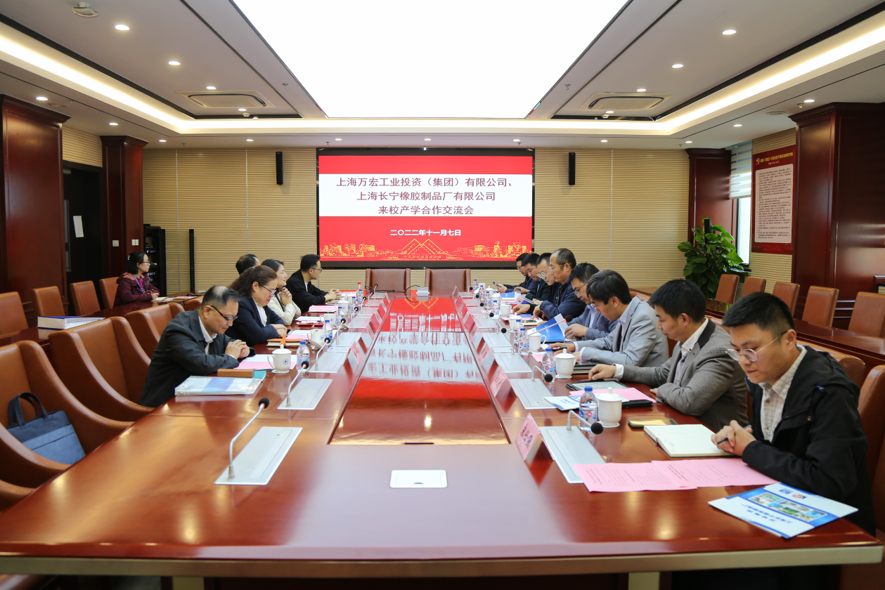 为促进企业发展,强化产教融合,11月7日下午,上海万宏工业投资(集团)有限公司、上海长宁橡胶制品厂有限公司领导来校进行产学合作交流。