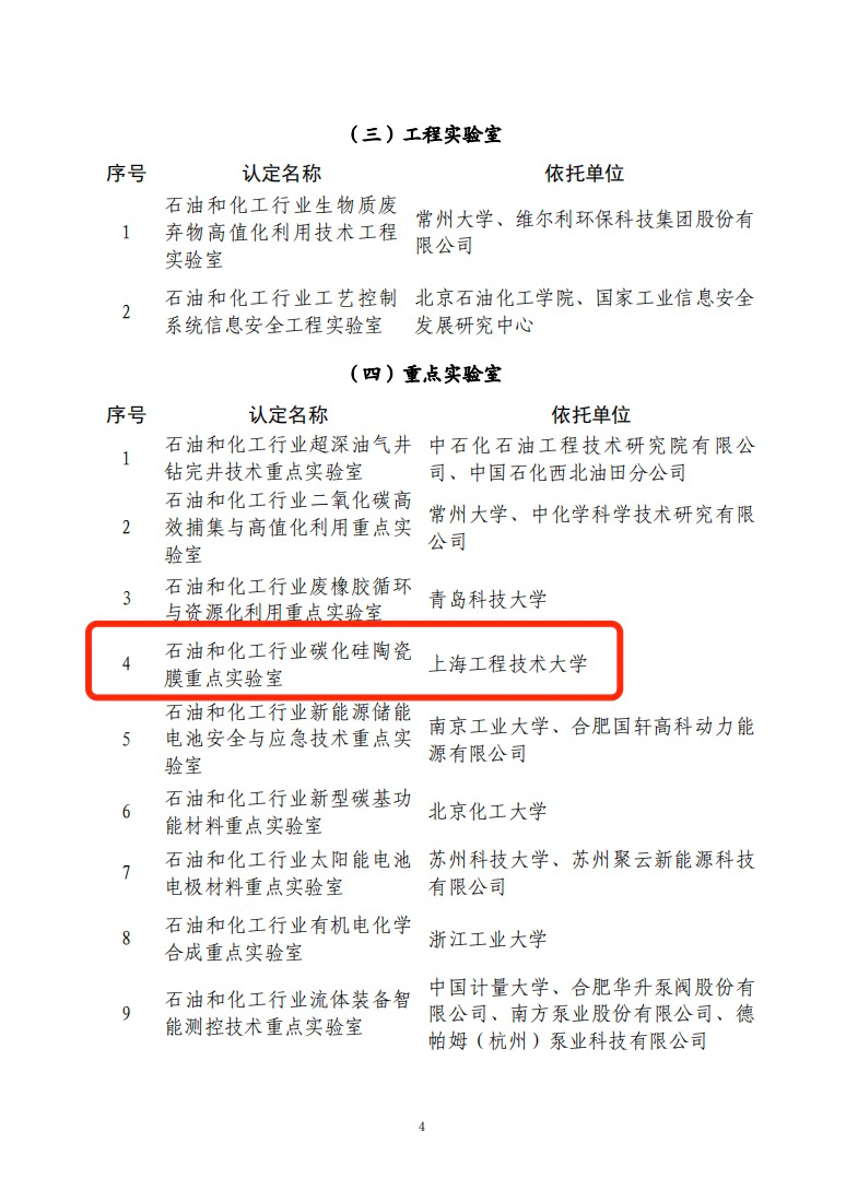 石油和化工行业碳化硅陶瓷膜重点实验是公司获批建设的第一个石化行业重点实验室,李光辉教授担任重点实验室主任,张楠教授和孙韬教授任副主任。重点实验室学术委员会由中科院硅酸盐研究所施剑林院士担任主任,中国石油化工集团公司梁爱民教授和北京化工大学邱介山教授担任副主任。该重点实验室紧密围绕高性能碳化硅陶瓷膜技术的关键科学问题和共性技术,瞄准碳化硅陶瓷膜技术发展前沿,形成了交叉与创新、应用基础与工程示范、科研与产业化相结合的鲜明特色。重点实验室前期在碳化硅陶瓷膜技术的理论和实践研究等方面取得了显著的成绩,在碳化硅陶瓷膜制备技术、产业化程度和工程应用等方面处于国内领先水平;产学研合作企业部分产品达到国外同类产品水平,产品替代进口并出口至德国和新加坡。