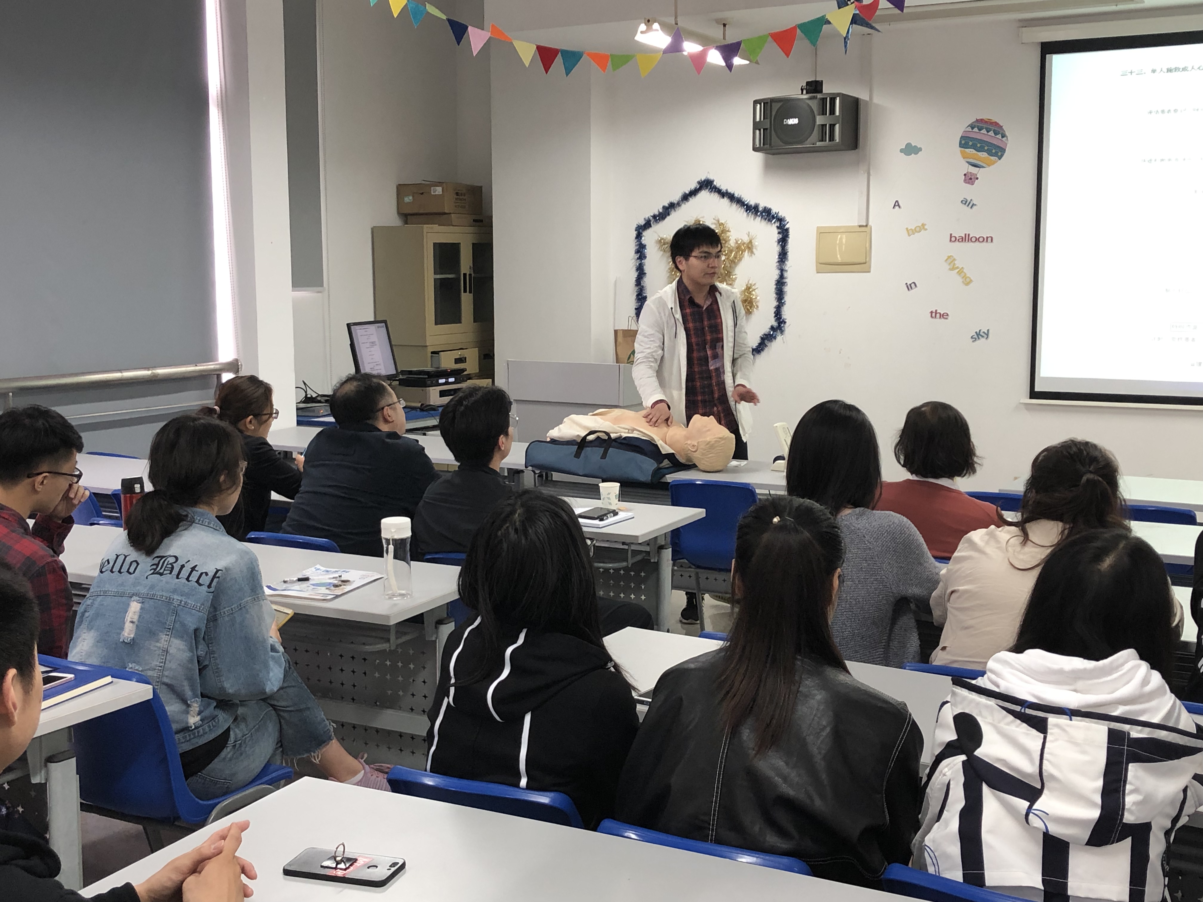 4月24日下午,第一人民医院组织部分科室见习医生来校为公司辅导员、研究生、本科生开展了性健康和生命支持术两场讲座。讲座生动活泼,以医院案例和实际操作为主,向老师员工介绍安全的性关系和如何进行有效防护,特别是生命支持术CPR的教学吸引师生的极大兴趣,部分师生现场模拟进行了生命急救的标准CPR程序,也让师生感受到拯救生命的意义。现场袁梦丹老师说:“拯救生命是一场与时间的赛跑,需要更多人的掌握生命支持的专业技能,参加这种培训让我感到救人的不易,胸压和人工呼吸需要很好的体力也要专业的手法,但模拟成功救起一个人时,看到绿灯亮起,真能感受到生命的可贵和价值”,员工刘昊宇说:“以前的培训大多是看着PPT,没有现场模拟过,这次体会很深,让我感受到生命的价值出自大家的相互守望和援助,我一定会在别人需要的时候伸出援手,让社会更加美好”。