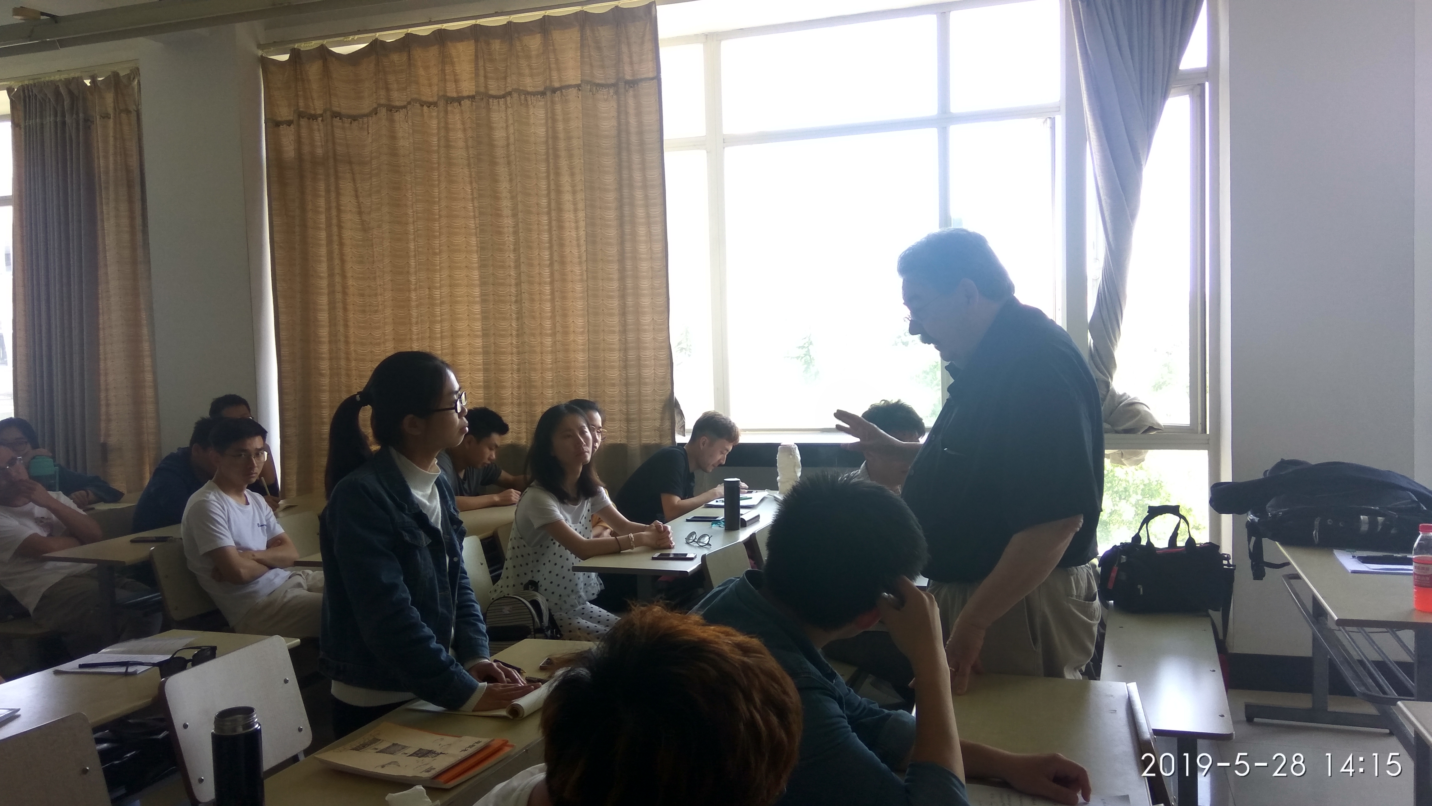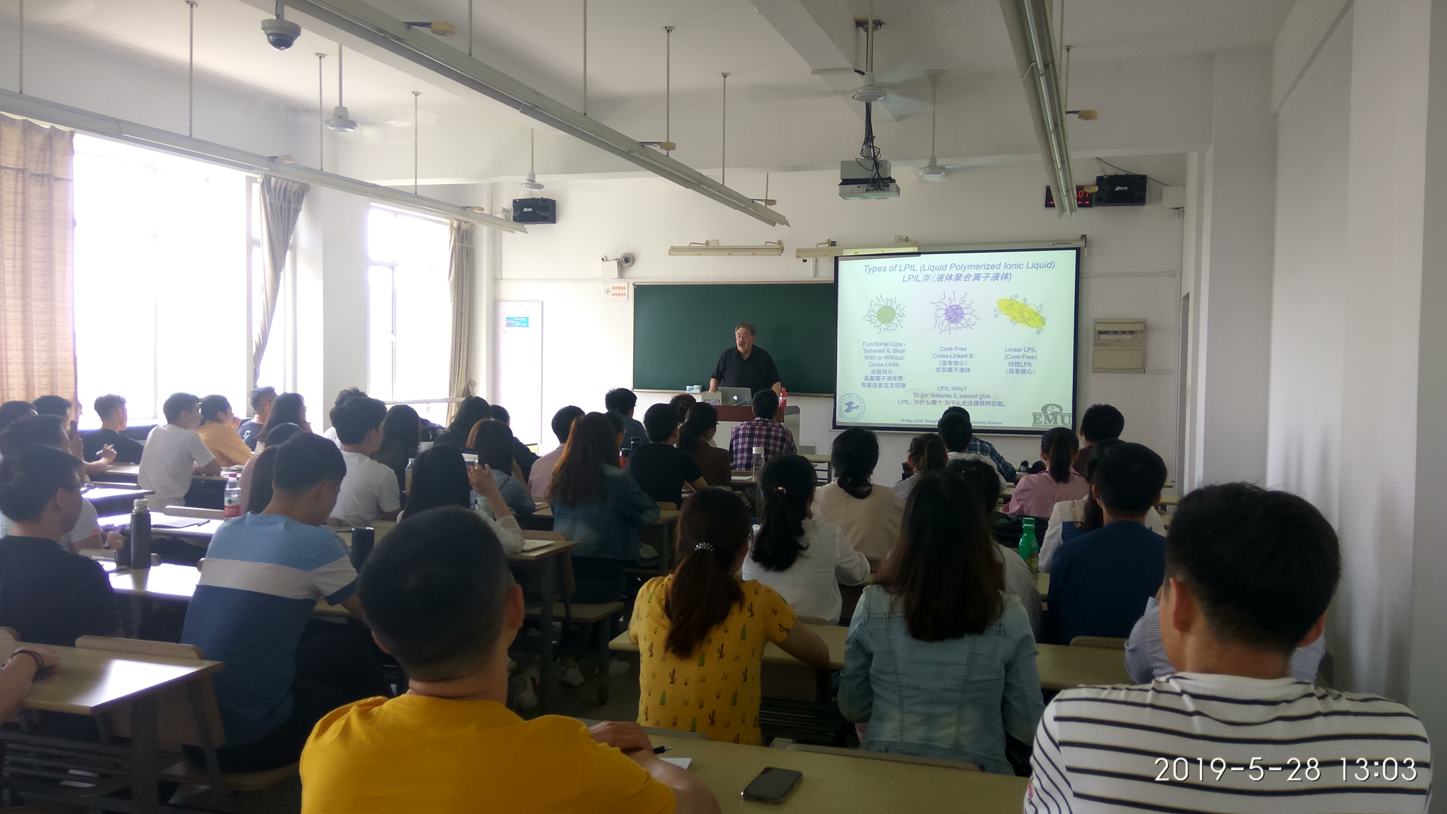 5月28日下午,世界著名涂料专家,美国东密歇根大学杰出教授John Texter应邀来校,在教学楼C411给365英国上市集团研究生和本科生作了《Liquid Polymerized Ionic Liquids for Advanced Materials and Coatings》的专题讲座,讲座由高分子材料与工程系主任王继虎主持。