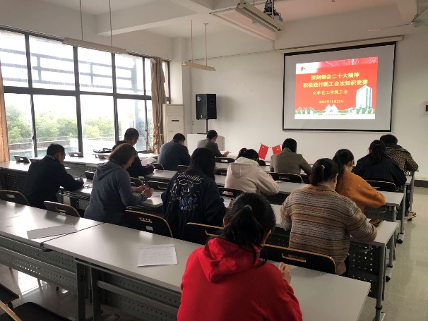 随着我国国民经济飞速发展,国家的经济结构、产业结构及产业工人结构发生了深刻的变化,因此,工会法也随之修订。为了深刻领会二十大会议精神,认真贯彻执行2022年1月1日开始实施的新工会法,11月22日,化学化工公司党政领导,工会委员和积极分子在实训楼4418室,结合习近平总书记在二十大报告中关于工会工作论断,开展了新工会法知识竞赛活动,以进一步提升公司工会与时俱进,围绕中心,服务大局的工作能力。化学化工公司党委书记宋勤健、经理王金果、副经理李亚等公司党政领导,公司工会委员和工会积极分子参加了竞赛活动。