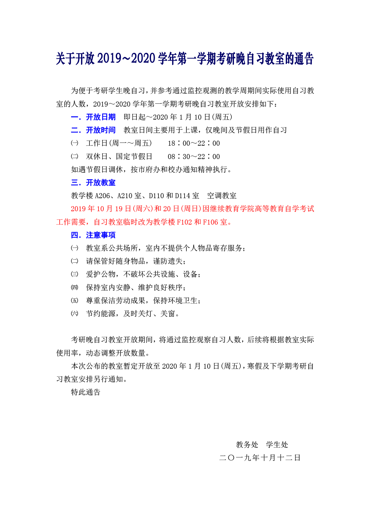 关于开放2019~2020学年第一学期考研晚自习教室的通告