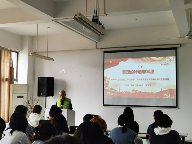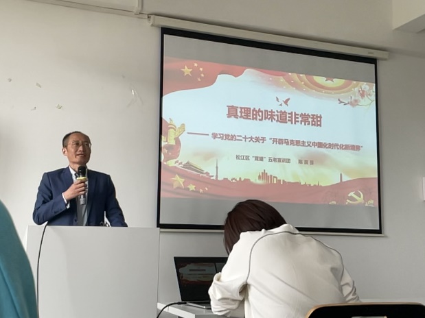 陈良保曾任松江区政协秘书长、办公室主任,现任松江区关心下一代工作委员会副主任,松江区“茸耀”五老宣讲团成员。宣讲会上,陈良保老师从党的二十大报告中提出的四个“新”、三个“大”、三个“事关”引入,结合《共产党宣言》诞生背后的故事、陈望道先生的事迹、《共产党宣言》与部分老一辈革命家的故事等深入讲解了马克思主义中国化时代化的发展历程。