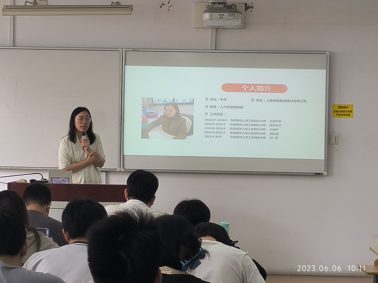 6月6日,上海伟星新型建材有限公司在教学楼A302开展校园招聘宣讲会,伟星集团上海工业园综合部经理朱潇来校为高分子、涂料专业员工开展招聘宣讲会,365英国上市集团团委书记郑文静老师主持。