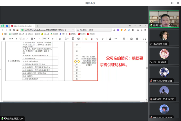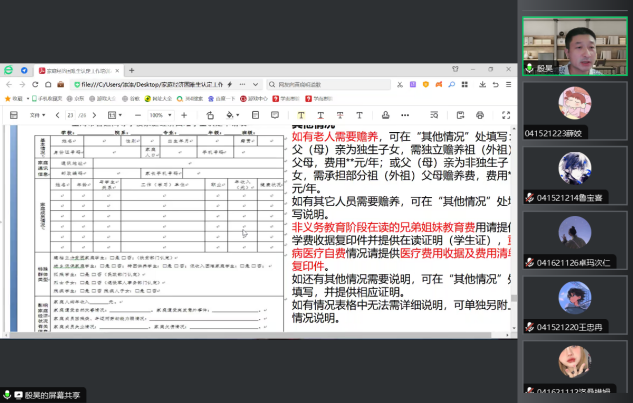 殷昊老师向员工们介绍了国家资助政策和公司帮扶政策,就困难生申请所需准备的材料和系统中申请表格填写注意事项等分类讲解,从员工家庭经济情况、民主评议情况以及公司综合评价三个方面为员工详细解释了内容和要求,并仔细说明了线上填写员工家庭经济情况表问题的细节、填写要求以及所需的具体材料,并就员工所提出的问题进行解释和答疑。