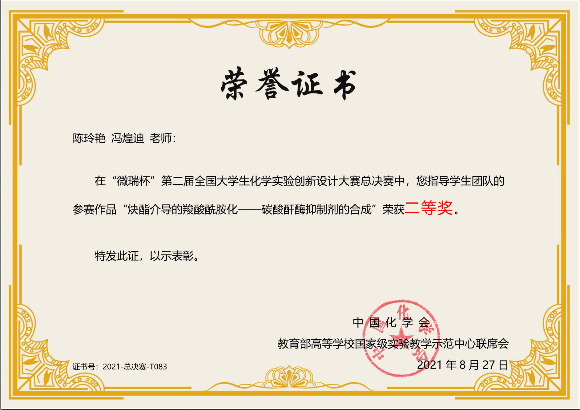 6.Regio- and Chemoselective Copper-Catalyzed Formal [2+2+2] Cycloaddition of Primary Amines with Arylacetylenes to 2,4,5-Trisubstituted Pyridines. Yujuan Xie, Liliang Huang, Huihui Feng, Yayu Qi, Erik V. Van der Eycken, Huangdi Feng. Organic Letters, 2022, 24, 6346–6350. (IF=5.2, SCI:一区)