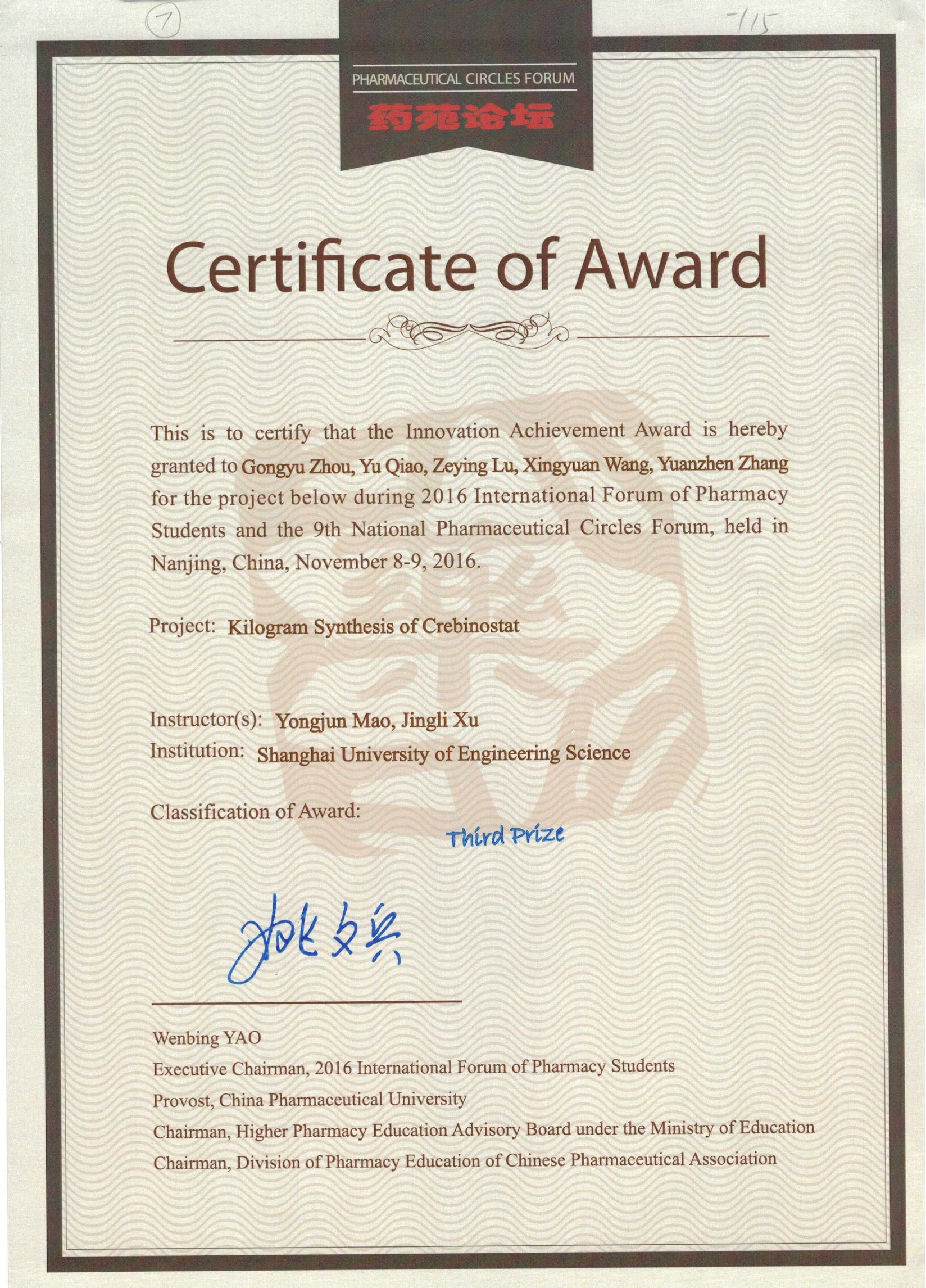 团队坚持个性发展、注重因材施教,目前在读研究生30余人,毕业硕士生中6人获国家公派留学奖学金、10余人攻读博士学位。另外,指导本科生在全国老员工制药工程设计竞赛、全国老员工化学实验创新设计竞赛、全国制药工程研究征文比赛、全国老员工药苑论坛、全国医药院校药学类实验技能竞赛、“创青春”上海市老员工创业大赛等屡获佳绩。