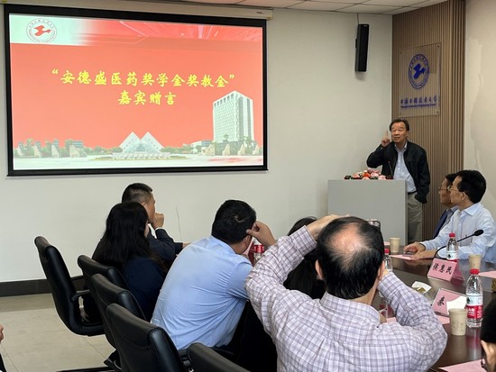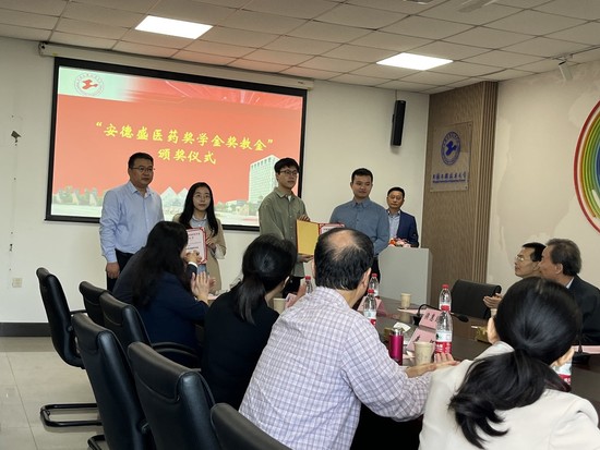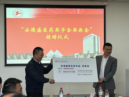 谢开平总监代表上海安德盛生命科技有限公司向公司捐赠为期三年的安德盛医药奖学金和奖教金,袁春平副经理代表医药前沿技术研究院接受捐赠并回赠感谢状,感谢上海安德盛生命科技有限公司对公司医药技术及其产品研发工作的支持。